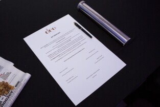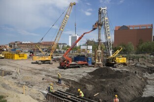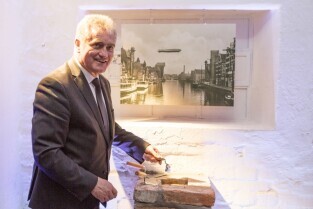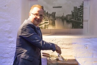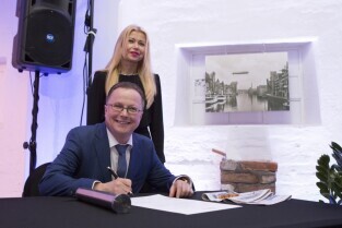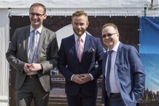 Gdańsk, północny cypel Wyspy Spichrzów. Wmurowanie kamienia węgielnego pod inwestycję Deo Plaza