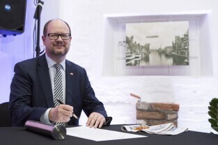 Gdańsk, północny cypel Wyspy Spichrzów. Wmurowanie kamienia węgielnego pod inwestycję Deo Plaza. Nz. Prezydent Gdańska Paweł Adamowicz