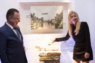 Gdańsk, północny cypel Wyspy Spichrzów. Wmurowanie kamienia węgielnego pod inwestycję Deo Plaza. Nz. inwestorzy Zbigniew i Wioletta Nowak