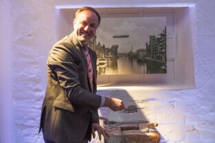 Gdańsk, północny cypel Wyspy Spichrzów. Wmurowanie kamienia węgielnego pod inwestycję Deo Plaza. Nz. Marszałek Woj. Pomorskiego Mieczysław Struk