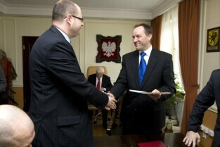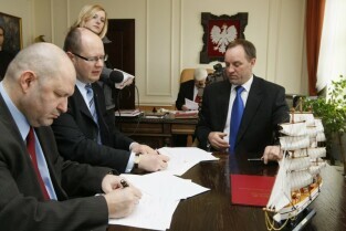 Gdańsk, Urząd Marszałkowski. Podpisanie umowy na dofinansowanie projektu "Budowa ulicy Nowej Łódzkiej". Umowę podpisali Marszałek Województwa Pomorskiego Mieczysław Struk (po prawej) oraz Prezydent Gdańska Paweł Adamowicz