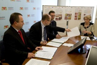 Gdańsk, Urząd Miejski. Podpisanie umowy na dofinansowanie projektu "Ochrona wód Zatoki Gdańskiej - budowa i modernizacja systemu odprowadzania wód opadowych w Gdańsku". Nz. od lewej: Z-ca Prezesa Narodowego Funduszu Ochrony Środowiska i Gospodarki Wodnej Władysław Jan Majka, Prezydent Gdańska Paweł Adamowicz, Burmistrz Pruszcza Gdańskiego Janusz Wróbel