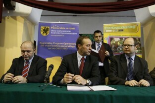 Pospisanie umowy na dofinansowanie z funduszy unijnych rewitalizacji Dolnego Miasta, w tym ul. Łąkowej. Gdańsk, Gimnazjum nr 9. Nz. od lewej: W-ce Marszałek Woj. Pomorskiego Wiesław Byczkowski, Marszałek Woj. Pomorskiego Mieczyław Struk, Prezydent Gdańska Paweł Adamowicz