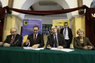 Pospisanie umowy na dofinansowanie z funduszy unijnych rewitalizacji Dolnego Miasta, w tym ul. Łąkowej. Gdańsk, Gimnazjum nr 9. Nz. od lewej: W-ce Marszałek Woj. Pomorskiego Wiesław Byczkowski, Marszałek Woj. Pomorskiego Mieczyław Struk, Prezydent Gdańska Paweł Adamowicz, Skarbik Gdańska Teresa Blacharska