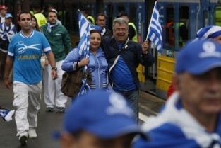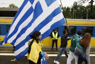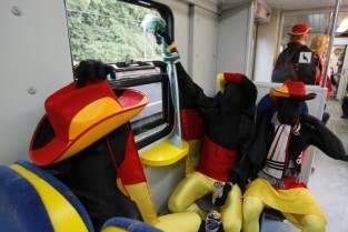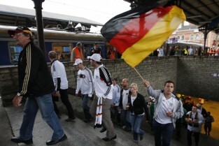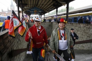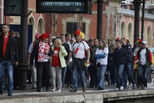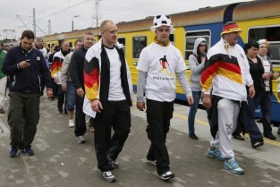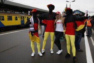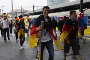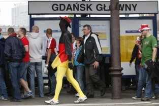 Kibice podróżujący kolejką SKM na stadion piłkarski w Gdańsku Letnicy, gdzie odbędzie się mecz ćwierćfinałowy mecz Grecja-Niemcy podczas UEFA Euro 2012