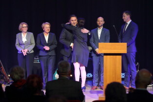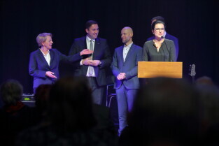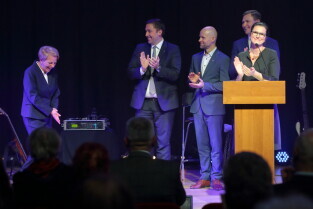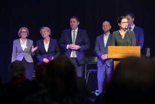 Gdańsk. Doroczne Obywatelskie Spotkanie Gdańszczan. Prezydent Aleksandra Dulkiewicz przedstawia swoich najbliższych współpracowników. Skarbnik Miasta Teresa Blacharska, sekretarz Miasta Danuta Janczarek i zastępcy pani prezydent: Piotr Borawski, Alan Aleksandrowicz i Piotr Grzelak.