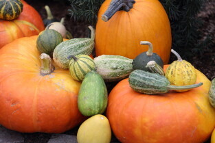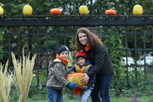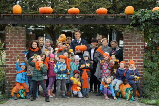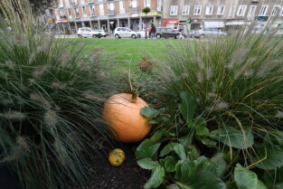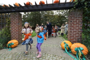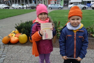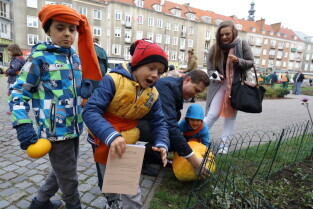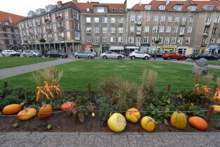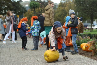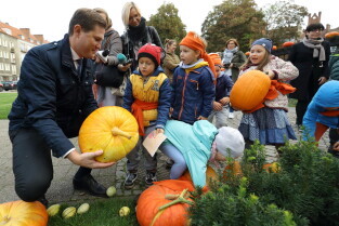 Gdańsk. Wiceprezydentt Gdańska Piotr Grzelak wspólnie z dziećmi z przedszkola nr 27 dekorowali Skwer Kobzdeja dyniami.