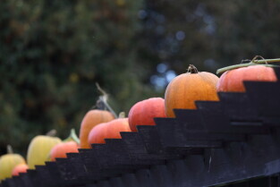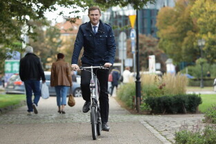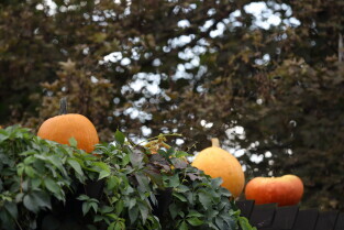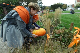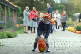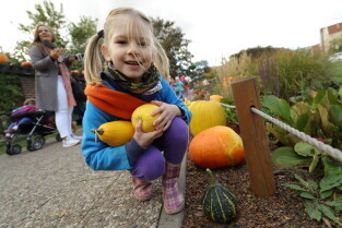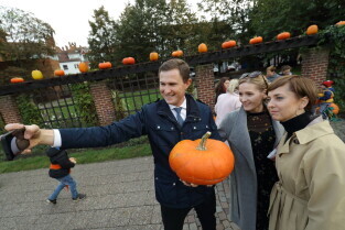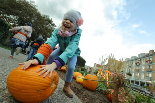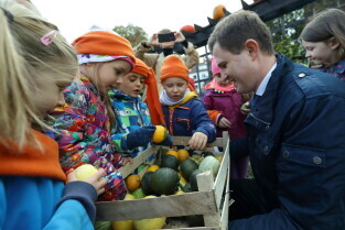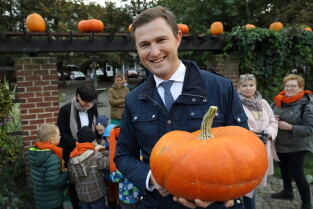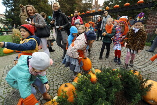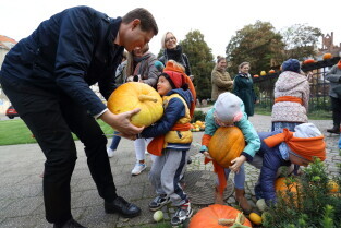 Gdańsk. Wiceprezydentt Gdańska Piotr Grzelak wspólnie z dziećmi z przedszkola nr 27 dekorowali Skwer Kobzdeja dyniami. Nz. Wiceprezydent Piotr Grzelak.