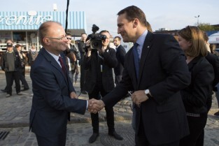 Działacze Euromajdanu, wcześniej nagrodzeniu Nagrodą Lecha Wałęsy, składają kwiaty na historycznej Bramie nr 2 Stoczni Gdańskiej. Nz. Z-ca Prezydenta Gdańska Maciej Lisicki i Marszałek Sejmu RP Radosław Sikorski