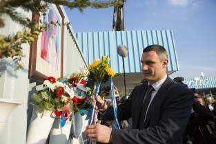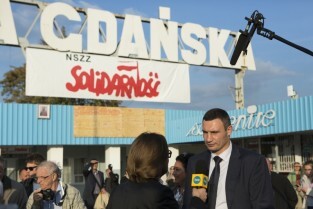 Działacze Euromajdanu, wcześniej nagrodzeniu Nagrodą Lecha Wałęsy, składają kwiaty na historycznej Bramie nr 2 Stoczni Gdańskiej. Nz. mer Kijowa Witalij Kłyczko