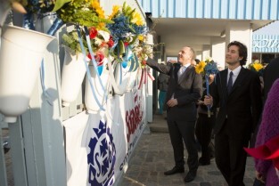 Działacze Euromajdanu, wcześniej nagrodzeniu Nagrodą Lecha Wałęsy, składają kwiaty na historycznej Bramie nr 2 Stoczni Gdańskiej. Nz. po prawej Minister Kultury Ukrainy Jewhen Nyszczuk
