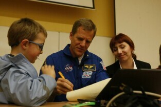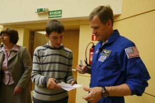 Politechnika Gdańska. Międzynarodowa Konferencja Naukowa dla Dzieci. Nz. amerykański astronauta Scott Parazynski rozdaje autografy
