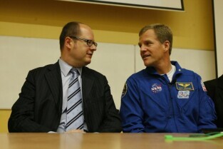 Politechnika Gdańska. Międzynarodowa Konferencja Naukowa dla Dzieci. Nz. amerykański astronauta Scott Parazynski rozdaje autografy. Nz. amerykański astronauta Scott Parazynski i Prezydent Gdańska Paweł Adamowicz