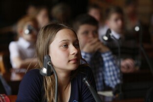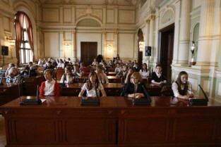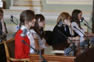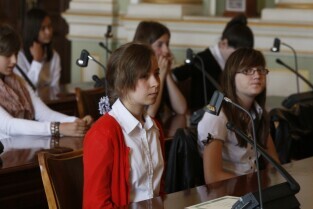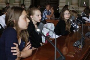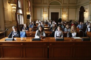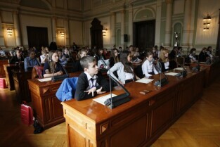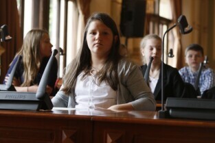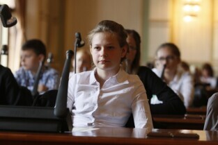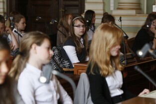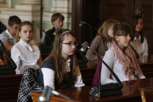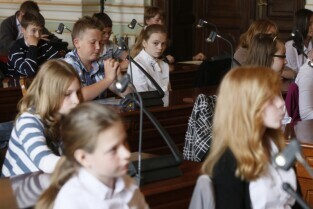 Dziecięca Sesja Rady Miasta, w której udział wzieli uczniowie gdańskich szkół osiągający dobre wyniki w nauce i aktywni w działalności pozalekcyjnej. Gdańsk, Nowy Ratusz