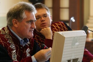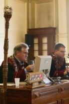 Dziecięca Sesja Rady Miasta, w której udział wzieli uczniowie gdańskich szkół osiągający dobre wyniki w nauce i aktywni w działalności pozalekcyjnej. Gdańsk, Nowy Ratusz. Nz. Przewodniczący Rady Miasta Gdańska Bogdan Oleszek i radny Adam Nieroda