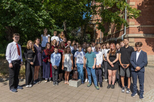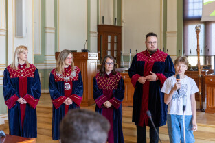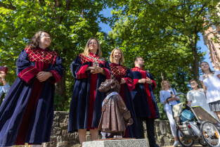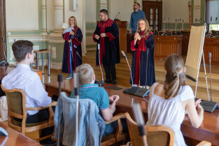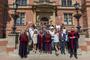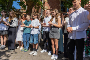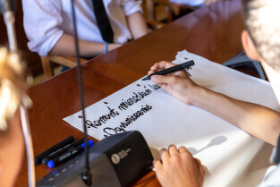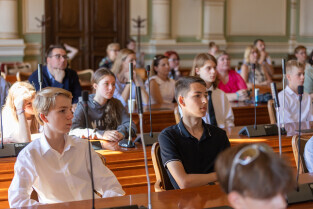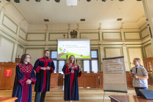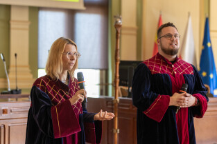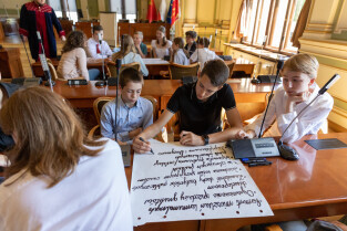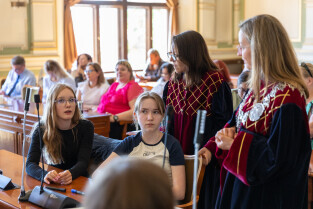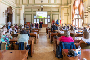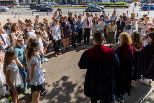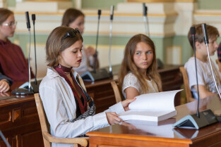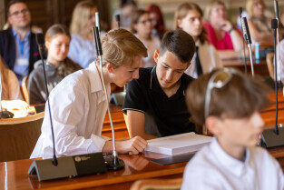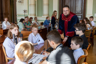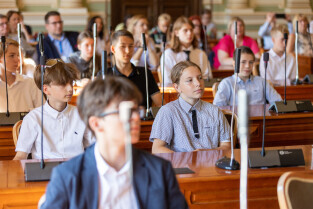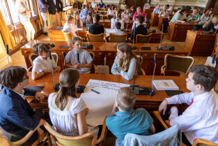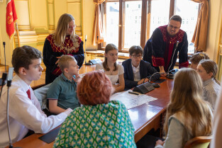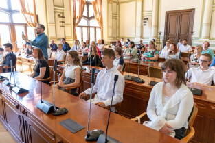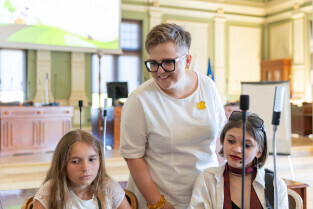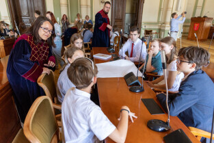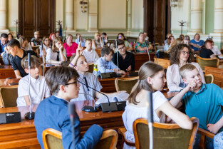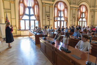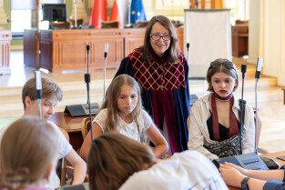 Gdańsk, ul. Wały Jagiellońskie. Dziecięca sesja w Radzie Miasta. Młodych gości powitała przewodnicząca Rady Miasta Gdańska Agnieszka Owczarczak wraz z radnymi Kamilą Błaszczyk, Anną Golędzinowską, Emilią Lodzińską oraz radnym Marcinem Makowskim