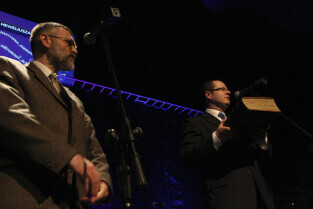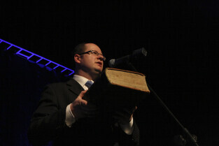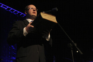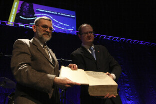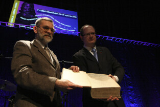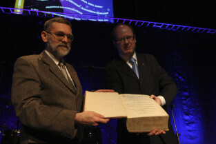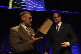 Prezydent Gdańska Paweł Adamowicz przekazuje na ręce dr Grzegorza Szychlińskiego z Muzeum Historycznego Miasta Gdańska XVII-wieczne dzieła "Machinae coelestis" i "Cometographia". Gdańsk, Filharmonia Bałtycka