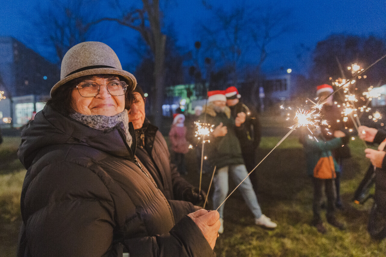 Gdańsk. Dzielnicowa choinka na Żabiance. Obecna była Aleksandra Dulkiewicz prezydent Gdańska oraz radni miejscy, Łukasz Bejm, Jan Perucki i Karol Ważny