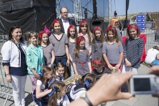 Gdańsk Letnica. Dzień Dziecka na PGE Arenie połączony z dniem otwartym stadionu. Nz. Prezydent Gdańska Paweł Adamowicz pozuje do zdjęć z uczestnikami festynu