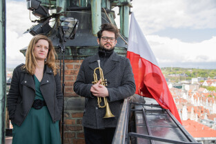 Gdańsk. Dzień Flagi - koncert carillonowy muzyki patriotycznej z wieży Ratusza Głównego Miasta. Nz. Monika Kaźmierczak, gdańska carillionistka i trębacz Emil Miszk