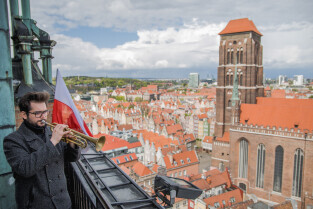Gdańsk. Dzień Flagi - koncert carillonowy muzyki patriotycznej z wieży Ratusza Głównego Miasta. Nz. trębacz Emil Miszk