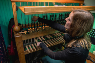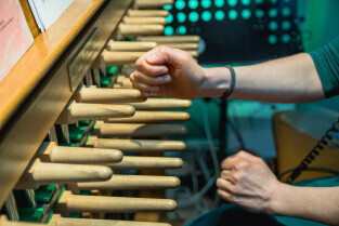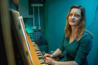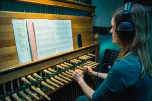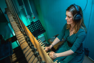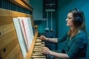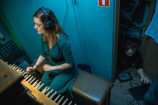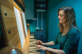 Gdańsk. Dzień Flagi - koncert carillonowy muzyki patriotycznej z wieży Ratusza Głównego Miasta. Nz. Monika Kaźmierczak, gdańska carillionistka