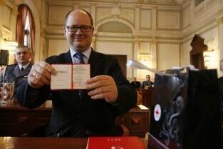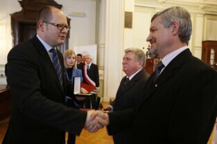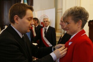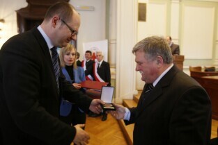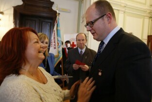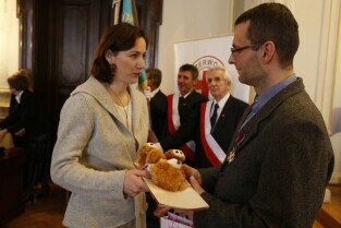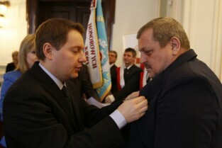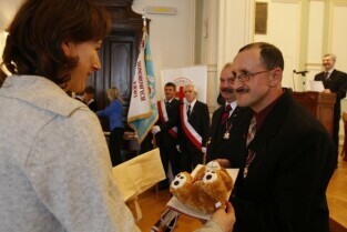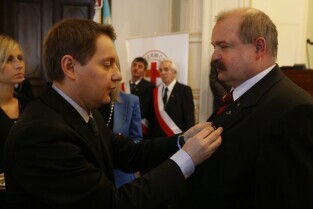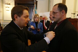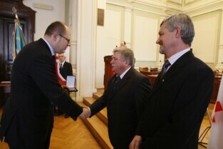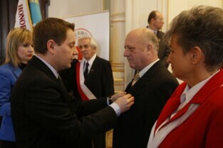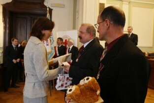 Z okazji Dnia Honorowego Krwiodawstwa przyznano odznaczenia zasłużonym krwiodawcom. Gdańsk Nowy Ratusz. Prezydent Gdańska Paweł Adamowicz, który oddał już 7 litrów krwi, otrzymał tytuł Zasłużony Honorowy Dawca Krwi