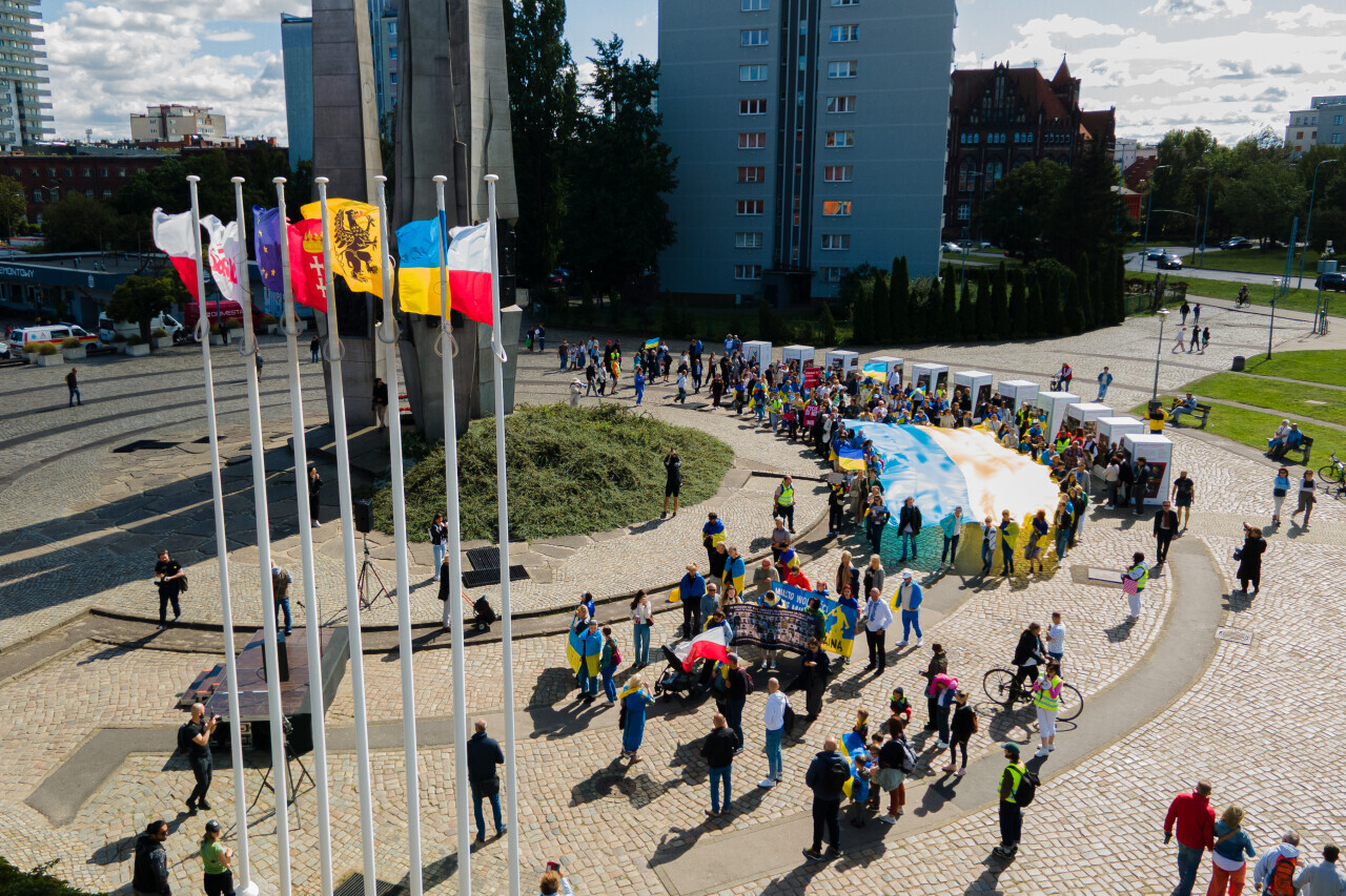 Gdańsk, plac Solidarności, przy Bramie nr.2. Przemarsz solidarności z Ukrainą z pomnika św. Włodzimierza Wielkiego do placu Solidarności. Trasa prowadzi ulicami Gnilną, Rajską, Jana Heweliusza, Karmelicką, Łagiewniki i Doki na plac Solidarności.