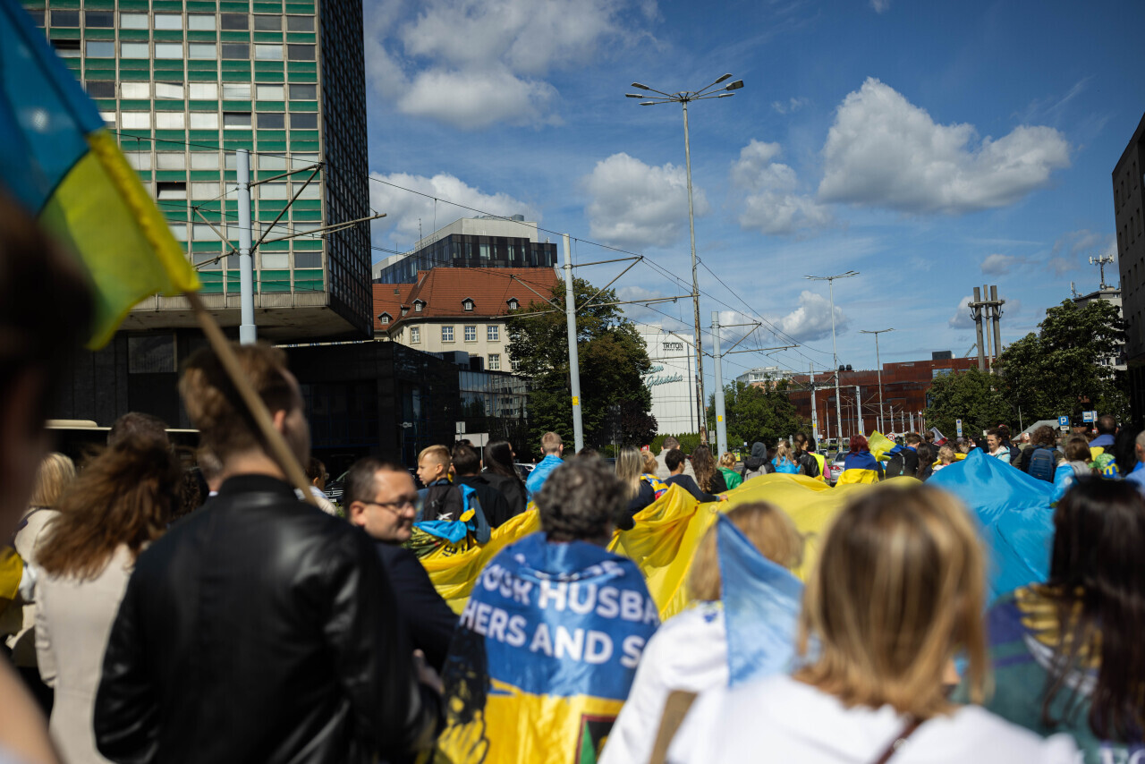 Gdańsk, plac Solidarności, przy Bramie nr.2. Przemarsz solidarności z Ukrainą z pomnika św. Włodzimierza Wielkiego do placu Solidarności. Trasa prowadzi ulicami Gnilną, Rajską, Jana Heweliusza, Karmelicką, Łagiewniki i Doki na plac Solidarności.