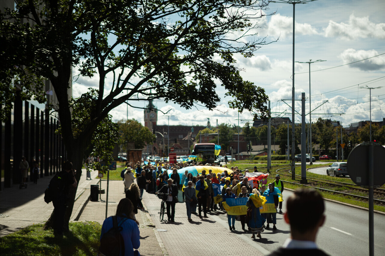 Gdańsk, plac Solidarności, przy Bramie nr.2. Przemarsz solidarności z Ukrainą z pomnika św. Włodzimierza Wielkiego do placu Solidarności. Trasa prowadzi ulicami Gnilną, Rajską, Jana Heweliusza, Karmelicką, Łagiewniki i Doki na plac Solidarności.