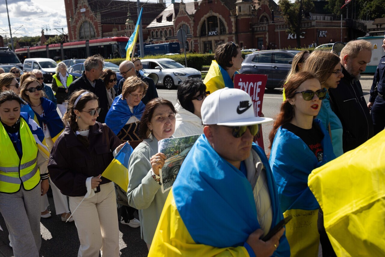 Gdańsk, plac Solidarności, przy Bramie nr.2. Przemarsz solidarności z Ukrainą z pomnika św. Włodzimierza Wielkiego do placu Solidarności. Trasa prowadzi ulicami Gnilną, Rajską, Jana Heweliusza, Karmelicką, Łagiewniki i Doki na plac Solidarności.