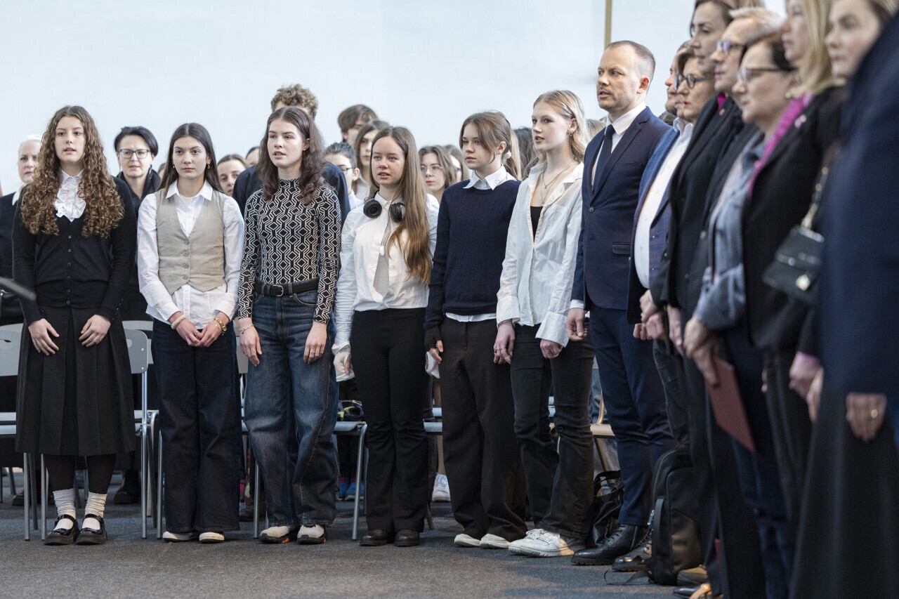 Gdańsk. Europosłanka Magdalena Adamowicz, poseł Piotr Adamowicz, Prezydent Aleksandra Dulkiewicz oraz radny Andrzej Kowalczys wzięli udział w uroczystych obchodach Dnia Patrona w Uniwersyteckim Liceum Ogólnokształcącym im.Pawła Adamowicza.
