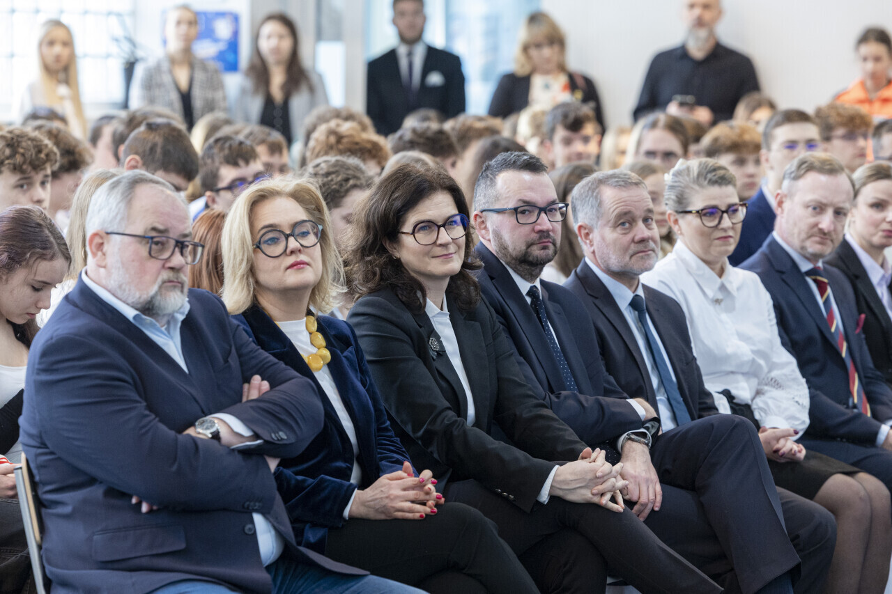 Gdańsk. Europosłanka Magdalena Adamowicz, poseł Piotr Adamowicz, Prezydent Aleksandra Dulkiewicz oraz radny Andrzej Kowalczys wzięli udział w uroczystych obchodach Dnia Patrona w Uniwersyteckim Liceum Ogólnokształcącym im.Pawła Adamowicza.