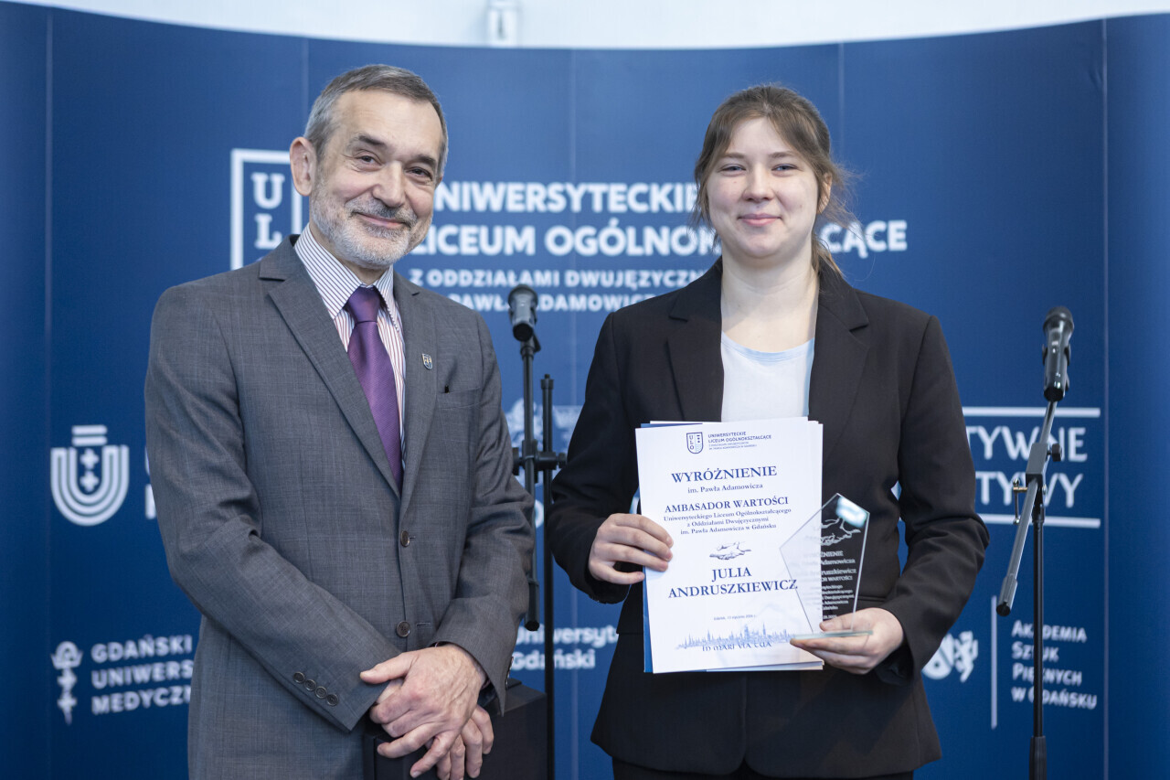 Gdańsk. Europosłanka Magdalena Adamowicz, poseł Piotr Adamowicz, Prezydent Aleksandra Dulkiewicz oraz radny Andrzej Kowalczys wzięli udział w uroczystych obchodach Dnia Patrona w Uniwersyteckim Liceum Ogólnokształcącym im.Pawła Adamowicza. Nz. Julia Andruszkiewicz - laureatka nagrody Ambasador Wartości