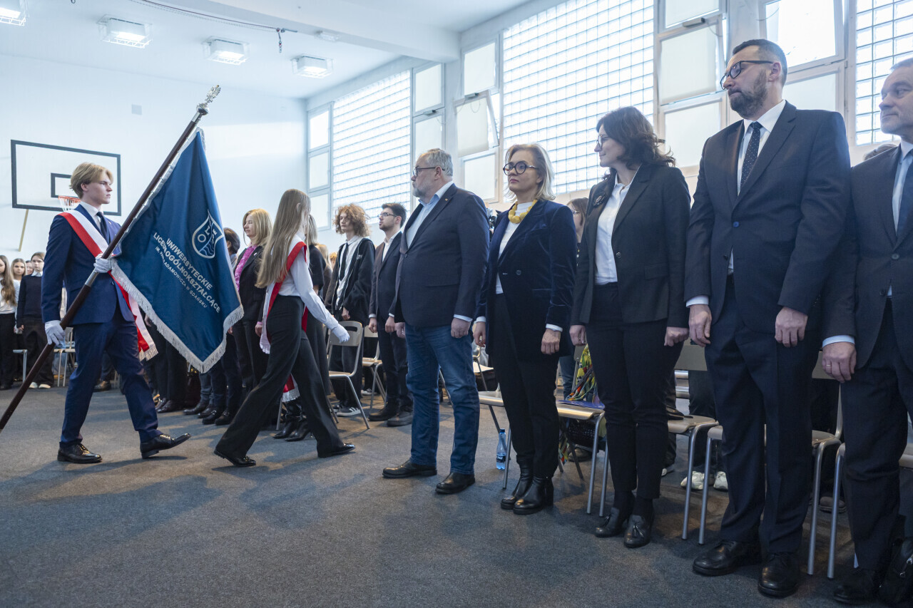 Gdańsk. Europosłanka Magdalena Adamowicz, poseł Piotr Adamowicz, Prezydent Aleksandra Dulkiewicz oraz radny Andrzej Kowalczys wzięli udział w uroczystych obchodach Dnia Patrona w Uniwersyteckim Liceum Ogólnokształcącym im.Pawła Adamowicza.
