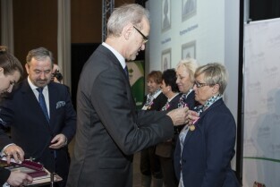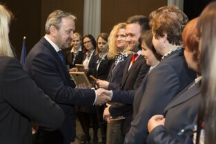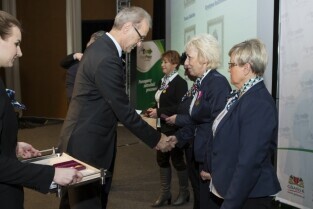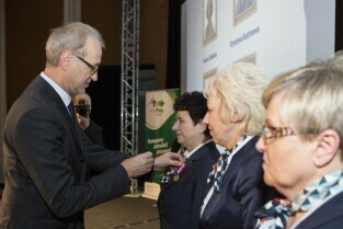 Konferencja z okazji Dnia Pracownika Publicznych Służb Zatrudnienia "Gdański Urząd Pracy bliżej pracodawców". Gdańsk, budynek NOT. Nz. okolicznościowe medale wręcza Prezydent Gdańska Paweł Adamowicz