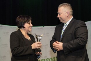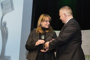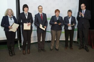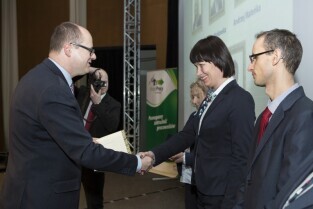 Konferencja z okazji Dnia Pracownika Publicznych Służb Zatrudnienia "Gdański Urząd Pracy bliżej pracodawców". Gdańsk, budynek NOT. Nz. Z-ca Prezydenta Gdańska Andrzej Bojanowski wręcza statuetki "Super Pracodawca 2014", którą w kategorii Duże Przedsiębiorstwo otrzymuje Spółdzielnia Mleczarska Polmlek-Maćkowy