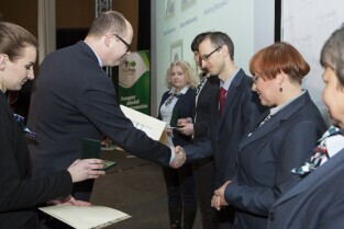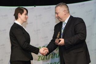 Konferencja z okazji Dnia Pracownika Publicznych Służb Zatrudnienia "Gdański Urząd Pracy bliżej pracodawców". Gdańsk, budynek NOT. Nz. Z-ca Prezydenta Gdańska Andrzej Bojanowski wręcza statuetki "Super Pracodawca 2014", którą w kategorii Małe Przedsiębiorstwo otrzymuje Gdańska Spółdzielnia Socjalna