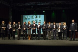 Konferencja z okazji Dnia Pracownika Publicznych Służb Zatrudnienia "Gdański Urząd Pracy bliżej pracodawców". Gdańsk, budynek NOT. Nz. Z-ca Prezydenta Gdańska Andrzej Bojanowski wręcza statuetki "Super Pracodawca 2014", którą w kategorii Średnie Przedsiębiorstwo otrzymuje Araol-Intermarche