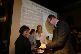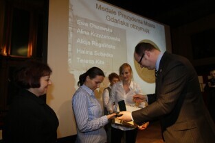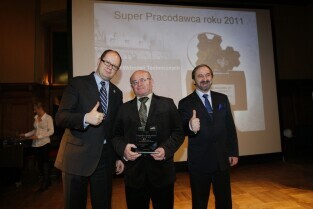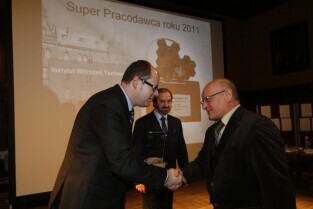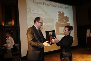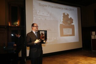 Gdańskie obchody Dnia Pracownika Służb Zatrudnienia. Gdańsk, Ratusz Staromiejski. Nz. Prezydent Gdańska Paweł Adamowicz wręcza nagrody w plebiscycie "Super Pracodawca 2011 r.", organizowanego przez Powiatowy Urząd Pracy w Gdańsku