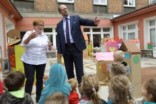 Gdańsk, Przedszkole 27 im. Panienki z okienka. Obchody Ogólnopolskiego Święta Przedszkolaka. Nz Dyrektor Przedszkola-Ewa Słomińska i Prezydent Gdańska Paweł Adamowicz.