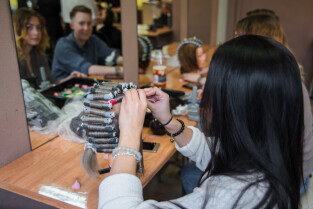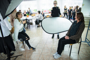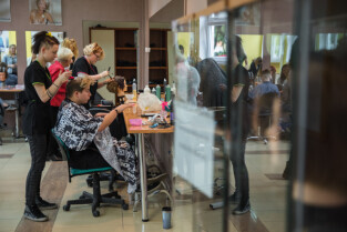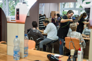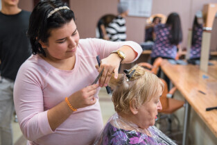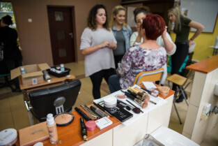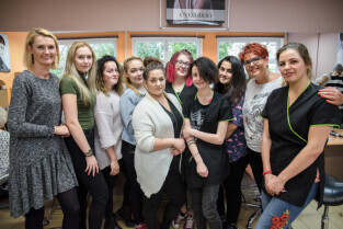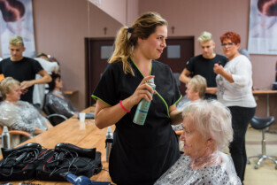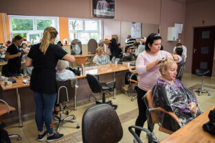 Gdańsk, ul. Dąbrowszczaków. Dzień Seniora w Zespole Szkół Kreowania Wizerunku. Nz. Anna Lisewska, druga od prawej, mistrz fryzjerstwa i nauczycielka