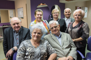Gdańsk, ul. Dąbrowszczaków. Dzień Seniora w Zespole Szkół Kreowania Wizerunku. Nz. z przodu: Helena i Edward Rogaczowie; od lewej Rajmund Leyk, Jadwiga Banker, Barbara Franczak, Henryk Bańkowski, Krystyna Fiedorowicz