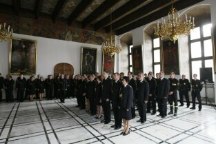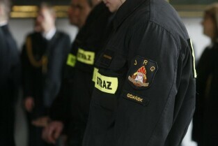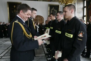 Dzień Strażaka, podczas którego wręczono awanse oraz nagrody dla strażaków. Gdańsk, Ratusz Głównomiejski. Nz. awanse wręczają: Pomorski Komendat Wojewódzki PSP st. bryg. Andrzej Rószkowski i Komendant Miejski PSP bryg. Wojciech Prusak