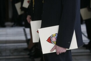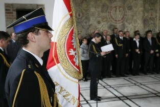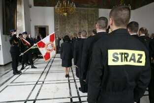 Dzień Strażaka, podczas którego wręczono awanse oraz nagrody dla strażaków. Gdańsk, Ratusz Głównomiejski