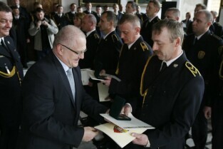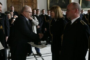 Dzień Strażaka, podczas którego wręczono awanse oraz nagrody dla strażaków. Gdańsk, Ratusz Głównomiejski. Nz. okolicznościowe medale wręcza Z-ca Prezydenta Gdańska Wiesław Bielawski