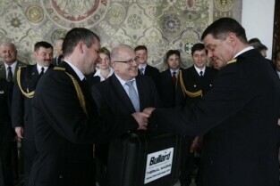 Dzień Strażaka, podczas którego wręczono awanse oraz nagrody dla strażaków. Gdańsk, Ratusz Głównomiejski. Nz. Z-ca Prezydenta Gdańska Wiesław Bielawski przekazuje gdańskim strażakom nowoczesną kamerę termowizyjną, którą odbiera Komendant Miejski PSP bryg. Wojciech Prusak