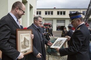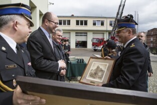 Uroczystość "Dnia Strażaka 2015". Gdańsk Wrzeszcz, Jednostka Ratowniczo-Gaśnicza nr 1 przy ul. Sosnowej. Nz. Komendant Miejski Straży Pożarnej w Gdańsku Wojciech Prusak wręcza grafiki z podziękowaniami, które otrzymują Prezydent Gdańska Paweł Adamowicz i Przewodniczący Rady Miasta Gdańska Bogdan Oleszek