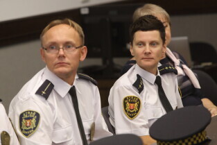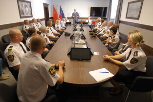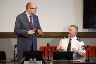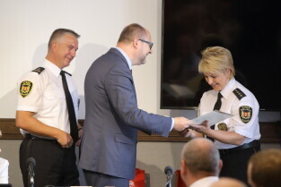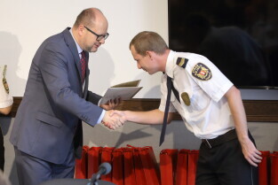 Gdańsk. Spotkanie Prezydenta Miasta Gdańska Pawła Adamowicza ze strażnikami miejskimi z okazji Dnia Straży Miejskiej – Prezydent wręczył nagrody wyróżniającym się funkcjonariuszom. Nz. Prezydent Gdańska Paweł Adamowicz i Leszek Walczak - Komendant Gdańskiej Straży Miejskiej.