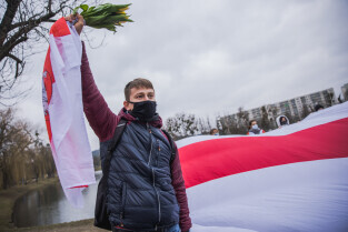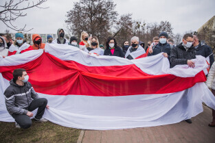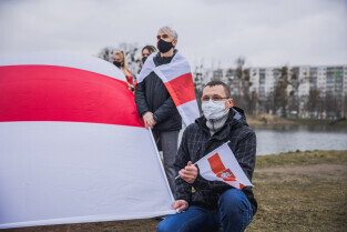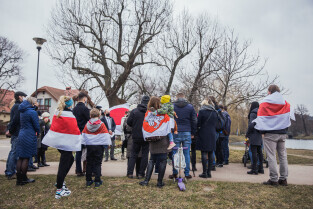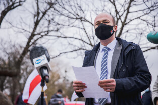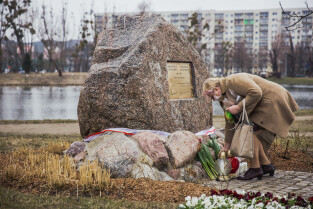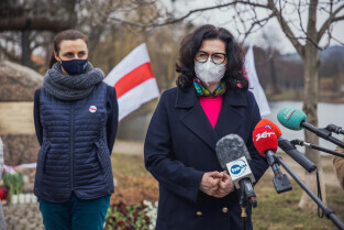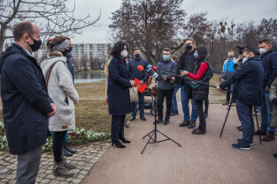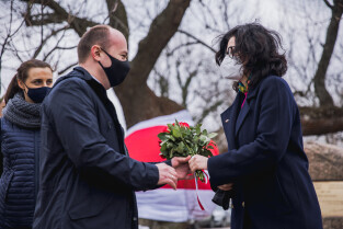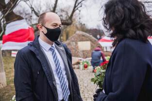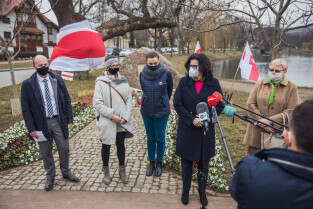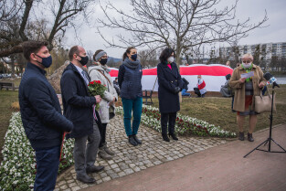 Gdańsk, ul. przy skwerze Janki Kupały. Dzień Wolności Białorusi. W spotkaniu udział wzięli, Aleksandra Dulkiewicz, prezydent Gdańska, Monika Chabior, zastępczyni prezydenta ds. rozwoju społecznego i równego traktowania oraz przedstawiciele gdańskich środowisk białoruskich